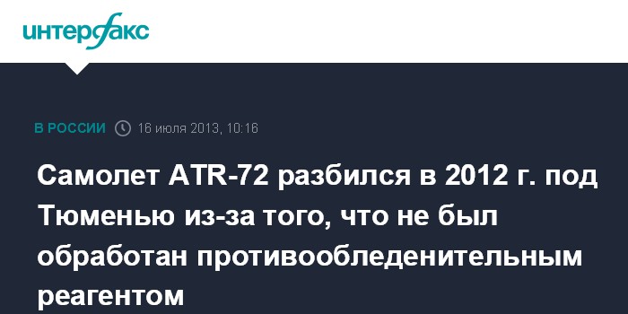 Самолет ATR-72 разбился в 2012 г. под Тюменью из-за того, что не был обработан противообледенительным реагентом