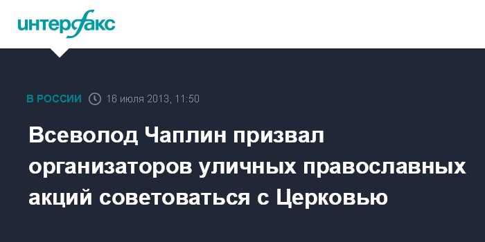 Москва. 16 июля. INTERFAX.RU - Глава синодального Отдела по взаимоотношениям Церкви и общества протоиерей Всеволод Чаплин выразил недоумение характером миссионерской акции, которая прошла на днях на Триумфальной площади Москвы, и призвал организаторов православных "перформансов" советоваться с представителями Церкви.