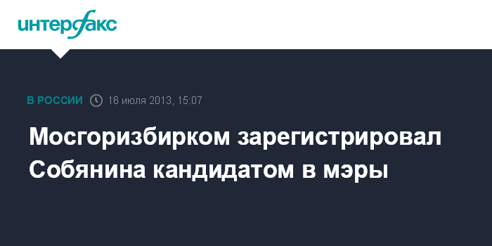 Москва. 16 июля. INTERFAX.RU - Решением Мосгоризбиркома, принятом на его заседании во вторник, самовыдвиженец Сергей Собянин зарегистрирован кандидатом на должность мэра столицы, сообщает корреспондент "Интерфакса".