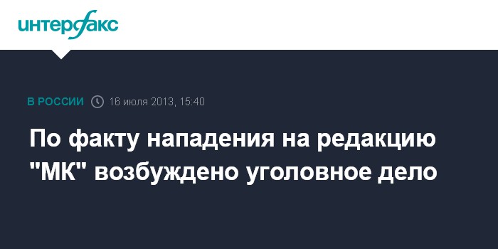 Москва. 16 июля. INTERFAX.RU - Уголовное дело возбуждено по факту хулиганской выходки около редакции газеты "Московский комсомолец" 8 июля, сообщили "Интерфаксу" в пресс-службе ГУ МВД России по Москве.