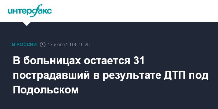 Москва. 17 июля. INTERFAX.RU - Количество пострадавших после аварии с участием автобуса в "новой Москве", которые остаются в больницах столицы и области, сократилось до 31 человека, сообщает пресс-служба Минздрава РФ. Среди госпитализированных - один ребенок.