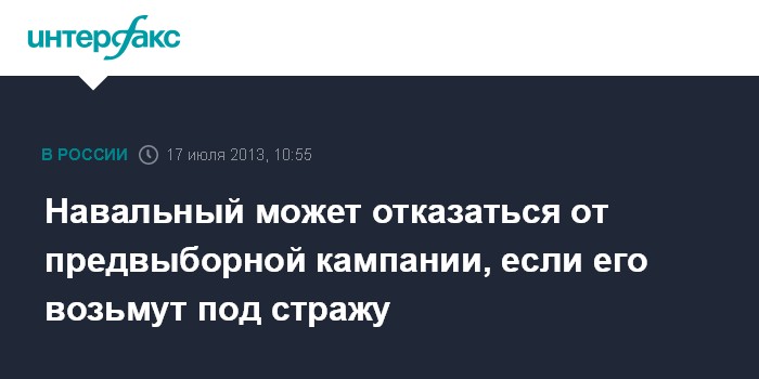 Москва. 17 июля. INTERFAX.RU - Кандидат в мэры Москвы Алексей Навальный заявил, что может отказаться от ведения предвыборной кампании, если будет заключен под стражу после оглашения приговора по "делу Кировлеса".