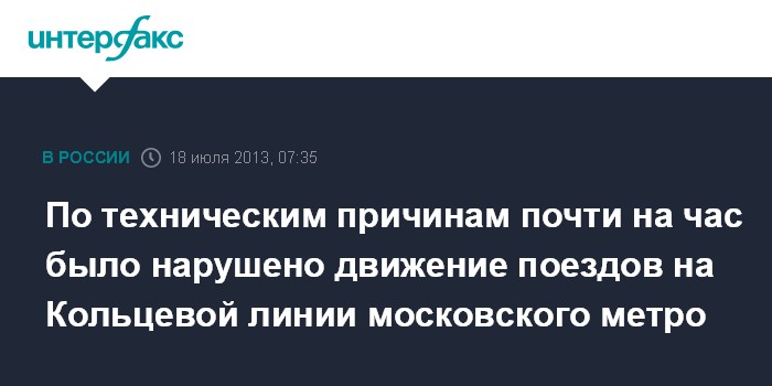 Москва. 18 июля. ИНТЕРФАКС-МОСКВА – График движения поездов на Кольцевой линии столичного метрополитена был нарушен по техническим причинам в четверг утром, сообщили "Интерфаксу" в пресс-службе "подземки".