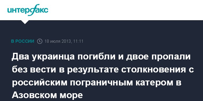 Киев. 18 июля. INTERFAX.RU - Во время столкновения украинского рыболовецкого баркаса с катером российских пограничников в Азовском море погибли два украинца, еще двое пропали без вести и их поиски продолжаются, сообщает Государственная пограничная служба Украины в четверг утром.