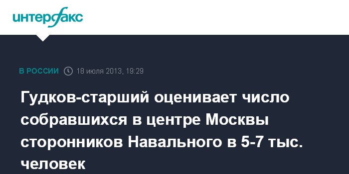 Москва. 18 июля. INTERFAX.RU - Несколько тысяч сторонников оппозиционера Алексея Навального вышли в центр Москвы на несанкционированную акцию, чтобы поддержать его, считает экс-депутат Госдумы от "Справедливой России" Геннадий Гудков. По его оценке, количество собравшихся - от 5 до 7 тыс. человек.