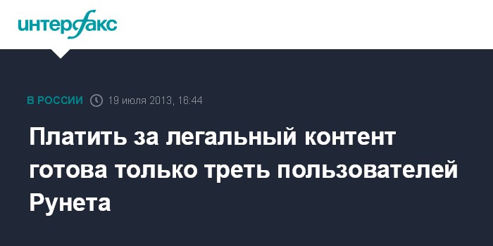 Москва. 19 июля. INTERFAX.RU - Только 25% российских интернет-пользователей готовы платить за легальный интернет-контент (24% в 2011 году), следует из материалов исследования "Авторское право и легальный контент в Сети: взгляд со стороны пользователя", подготовленного фондом "Общественное мнение" (ФОМ) и порталом TheRunet.com.
