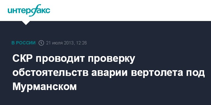 Москва. 21 июля. INTERFAX.RU - Следователи приступили к выяснению обстоятельств крушения вертолета в Мурманской области, при которой, по предварительным данным, погибли два человека, сообщили в пресс-службе СКР. "В настоящее время следователи Северо-Западного следственного управления СКР на транспорте выехали на место происшествия. Начата доследственная проверка", - сказали в пресс-службе в воскресенье "Интерфаксу".