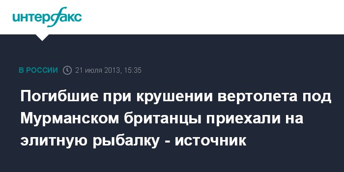 Мурманск. 21 июля. INTERFAX.RU - Двое британцев, погибших во время крушения частного вертолета в Мурманской области в воскресенье, приехали на элитную рыбалку.