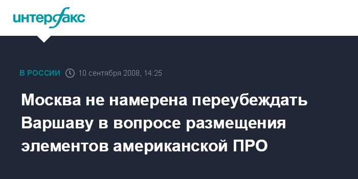 Москва. 10 сентября. INTERFAX.RU - Россия не будет отговаривать Польшу размещать на своей территории элементы американской ПРО, хотя и считает решение Варшавы ошибочным.