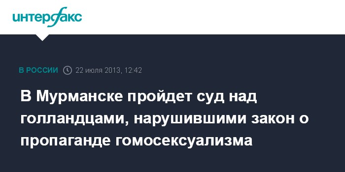 Мурманск. 22 июля. INTERFAX.RU- В Мурманске в понедельник состоится суд над четырьмя гражданами Нидерландов, нарушившими закон о пропаганде нетрадиционных сексуальных отношений среди несовершеннолетних.