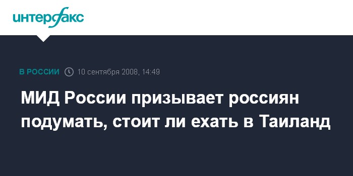 Москва. 10 сентября. INTERFAX.RU - МИД России в связи с сохранением остроты политической ситуации в Таиланде по-прежнему рекомендует российским туристам взвешенно подходить к решению о поездке в эту страну.