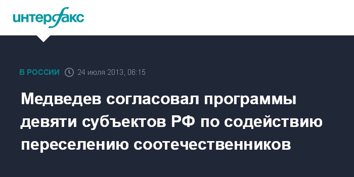 Москва. 24 июля. ИНТЕРФАКС - Премьер-министр РФ Дмитрий Медведев согласовал региональные программы Алтайского края, Тамбовской, Воронежской, Новосибирской, Кемеровской, Смоленской, Саратовской, Иркутской, Калужской областей по оказанию добровольного переселения соотечественников, проживающих за рубежом.