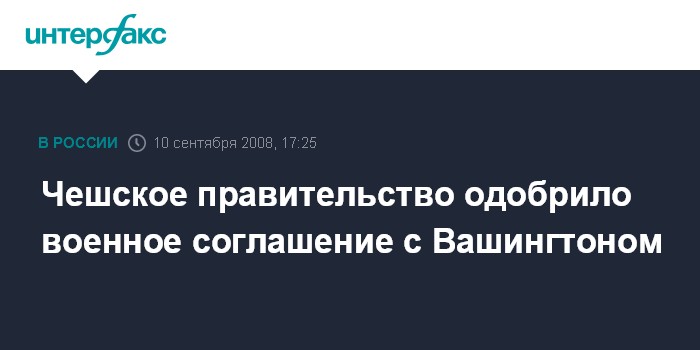 Прага. 10 сентября. INTERFAX.RU - Правительство Чехии одобрило военное соглашение с США, предусматривающее размещение американских военных на базе ПРО, которую планируется создать на чешской территории.