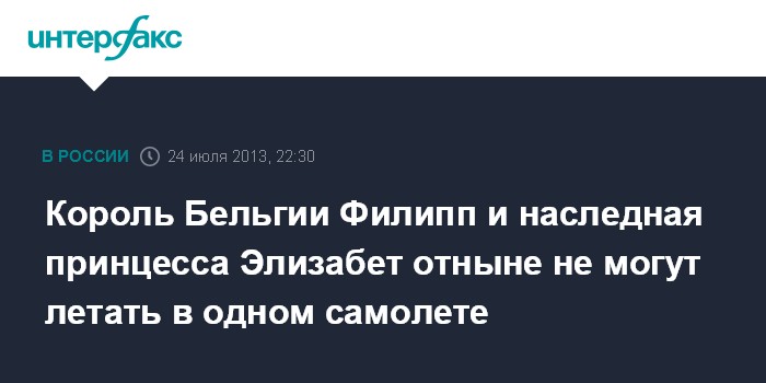 Брюссель. 25 июля. INTERFAX.RU - Следуя традиции, а также из соображений предосторожности, король Бельгии Филипп и его старшая дочь Элизабет больше не будут летать в одном лайнере, сообщил в среду королевский дворец.