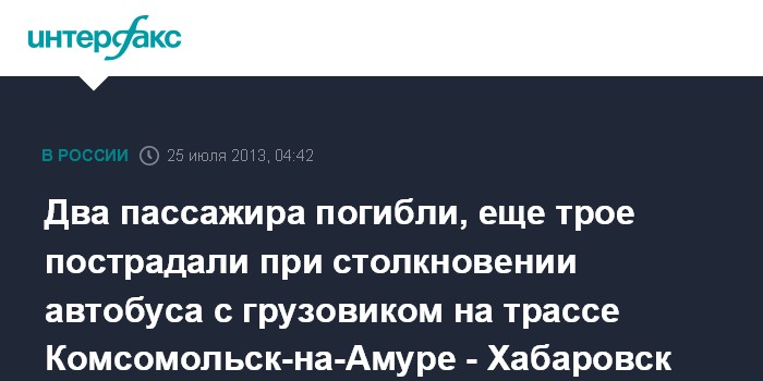 Хабаровск. 25 июля. ИНТЕРФАКС-ДАЛЬНИЙ ВОСТОК - Рейсовый автобус столкнулся с "КАМАЗом" на 100 км трассы Комсомольск-на-Амуре - Хабаровск.