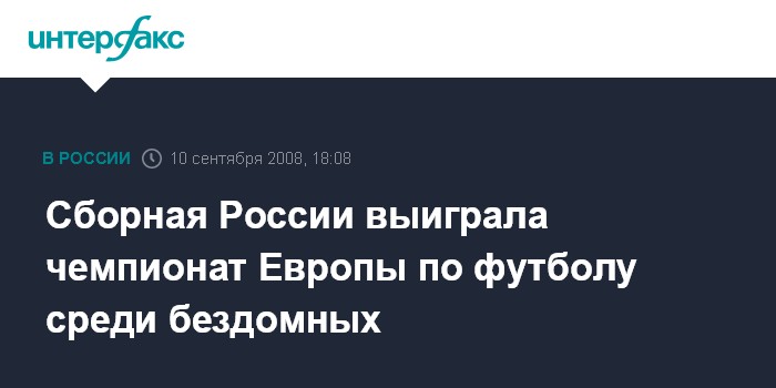 Москва. 10 сентября. INTERFAX.RU - Сборная России, в которую вошли бездомные из Петербурга, выиграла чемпионат Европы по футболу в Гданьске.