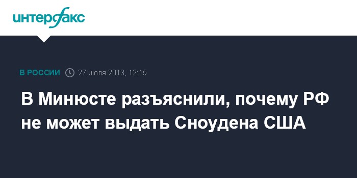Москва. 27 июля. INTERFAX.RU - Россия не может выдать США бывшего сотрудника ЦРУ Эдварда Сноудена из-за отсутствия в международном праве термина "принудительное возвращение", сообщили в пресс-службе Минюста России.