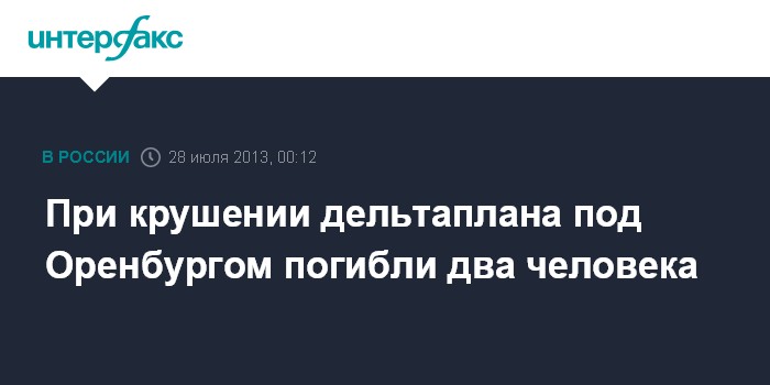 Москва. 28 июня. ИНТЕРФАКС – В Оренбургской области разбился дельтаплан, два человека погибли, сообщили "Интерфаксу" в МЧС РФ.