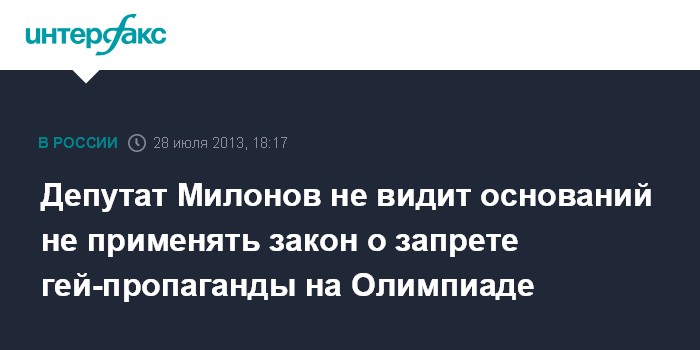 Санкт-Петербург. 28 июля. INTERFAX.RU - Председатель комитета по законодательству Законодательного собрания Петербурга и автор городского закона о запрете гей-пропаганды Виталий Милонов считает, что под действие аналогичного федерального закона попадают гости и участники Олимпиады в Сочи в 2014 году.