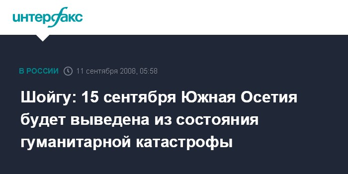 "В нашу задачу входит наладить элементарные условия жизни в республике, восстановить первоочередное жизнеобеспечение региона. Ликвидировать угрозу жизни и здоровью человека. Это я вам говорю как глава МЧС. Чтобы было тепло, чтобы можно было пойти купить еду в магазине, было где полечиться и т.д. Вот эту задачу мы выполним. 15 сентября полностью выведем Южную Осетию из состояния гуманитарной катастрофы", - сказал министр в интервью "Российской газете", публикуемом в четверг.