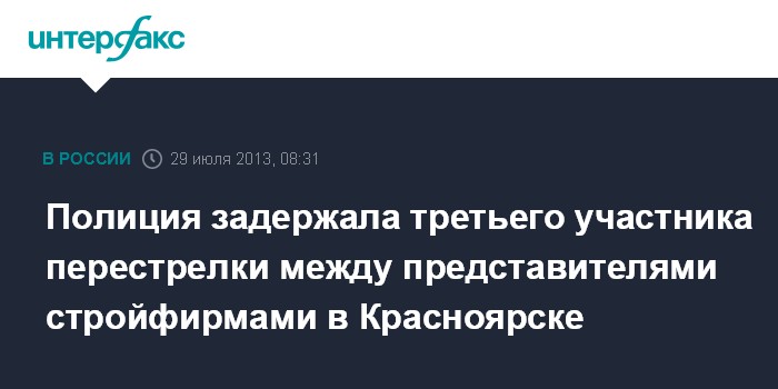 Красноярск. 29 июля. INTERFAX.RU - Задержан мужчина, подозреваемый в причинении смертельных ранений в ходе перестрелки между стройфирмами в Красноярске, сообщила агентству "Интерфакс-Сибирь" начальник пресс-службы ГУ МВД России по Красноярскому краю Ирина Мужецкая.