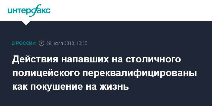 Москва. 29 июля. INTERFAX.RU - Следователи переквалифицировали нападение на столичного полицейского на западе Москвы со статьи о применении насилия на статью о покушении на его жизнь, сообщил официальный представитель СКР Владимир Маркин.