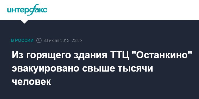 Москва. 30 июля. INTERFAX.RU - Спасатели эвакуировали из горящего здания ТТЦ "Останкино" свыше 1 тысячи человек, в здании горят декорации, сообщил "Интерфаксу" начальник пресс-службы ГУ МЧС России по Москве Виктор Бирюков.