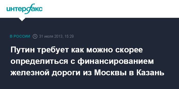 Ново-Огарево. 31 июля. INTERFAX.RU - Президент РФ Владимир Путин потребовал в самые короткие сроки определиться со схемой финансирования проекта строительства высокоскоростной железной дороги Москва - Казань.