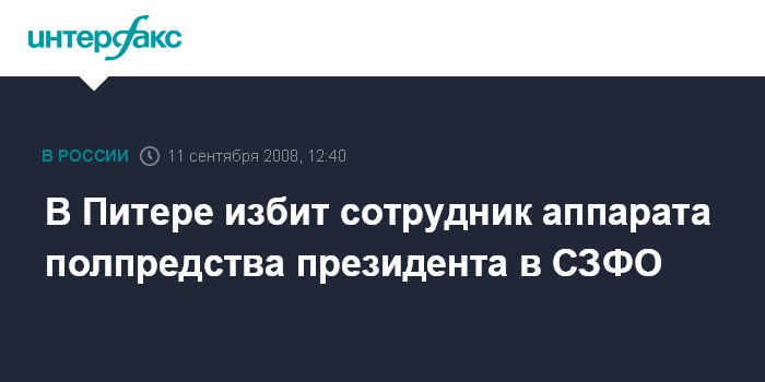 Санкт-Петербург. 11 сентября. INTERFAX.RU - В Санкт-Петербурге накануне днем избили сотрудника аппарата полномочного представителя президента РФ в СЗФО, сообщил "Интерфаксу" источник в правоохранительных органах города.