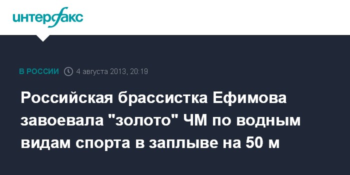 Москва. 4 августа. INTERFAX.RU - Россиянка Юлия Ефимова стала обладательницей золотой медали в заплыве на 50 м брассом на чемпионате вида по водным видам спорта в Барселоне.