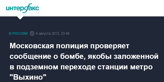Москва. 4 августа. ИНТЕРФАКС - Столичная полиция проверяет сообщение о взрывном устройстве, заложенном в комплексе подземных переходов станции Московского метрополитена "Выхино", сообщили "Интерфаксу" в пресс-службе ГУ МВД по Москве.