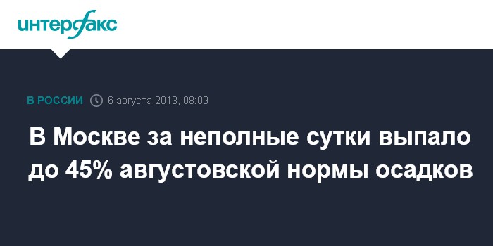 Москва. 6 августа. INTERFAX.RU - Ливень, обрушившийся на столичный регион в понедельник, принес с собой свыше 40% месячной нормы осадков, сообщили "Интерфаксу" в Гидрометеобюро Москвы и Московской области во вторник.
