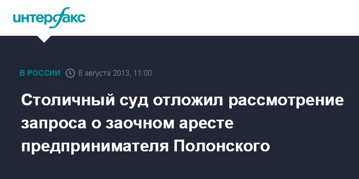Москва. 6 августа. INTERFAX.RU - Тверской суд Москвы во вторник перенес рассмотрение ходатайства следствия о заочном аресте бизнесмена Сергея Полонского.