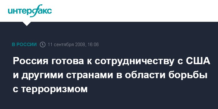 Москва. 11 сентября. INTERFAX.RU - Россия готова к полноценному сотрудничеству по вопросам по борьбы с терроризмом как с США, так и с другими странами, заявил президент РФ Дмитрий Медведев.