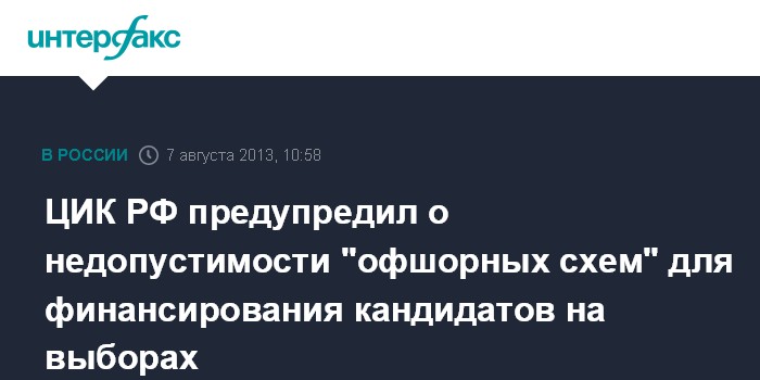 Москва. 7 августа. INTERFAX.RU - В руководстве ЦИК предостерегают участников выборов от использования офшорных схем для формирования избирательных фондов.
