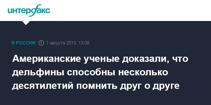 Вашингтон. 7 августа. INTERFAX.RU - Ученые из Чикагского университета определили, что дельфины обладают отличной социальной памятью и хранят воспоминания друг о друге в течение многих лет, сообщает в среду американская газета The Washington Post.