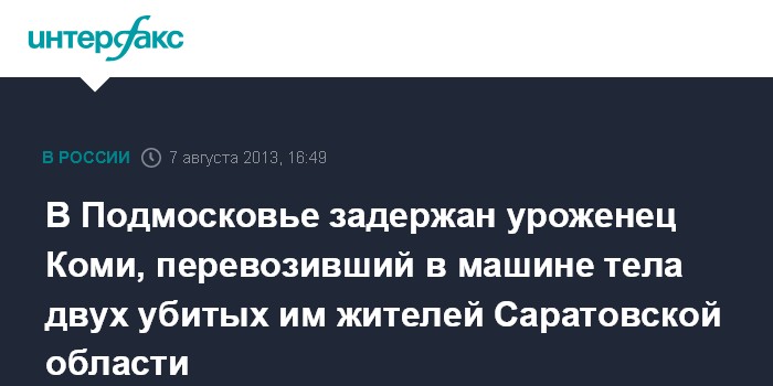 Москва. 7 августа. INTERFAX.RU - Подмосковные полицейские задержали в Орехово-Зуево уроженца Коми, который перевозил тела двоих убитых им людей на заднем сидении своей машины, сообщили в пресс-службе ГУ МВД по Московской области.