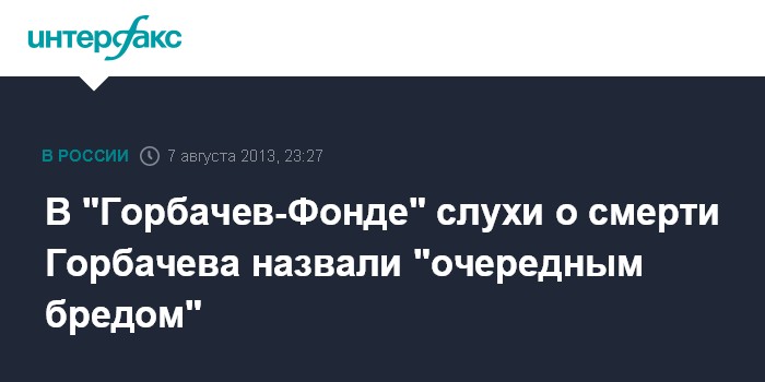 Москва. 7 августа. INTERFAX.RU - "Очередным бредом" назвали слухи о якобы смерти экс-президента СССР Михаила Горбачева.