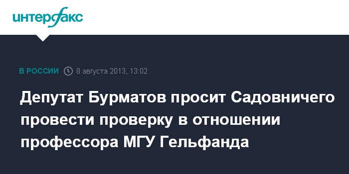 Москва. 8 августа. INTERFAX.RU - Депутат Госдумы Владимир Бурматов обратился к ректору МГУ Виктору Садовничему с просьбой проверить участие оппозиционера и профессора МГУ Михаила Гельфанда в распределении бюджетных средств по итогам конкурса, в котором победили в числе прочих его ученики.