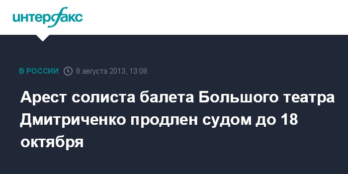 Как передает корреспондент "Интерфакса", такое решение суд принял по ходатайству следствия, которое просило оставить ведущего солиста балета ГАБТ Павла Дмитриченко под стражей.
