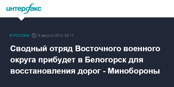 Москва. 9 августа. ИНТЕРФАКС - Сводный отряд 102-й отдельной бригады материально-технического обеспечения Восточного военного округа (город Улан-Удэ) прибудет в пятницу в город Белогорск Амурской области для оказания помощи в проведении ремонтно-восстановительных работ в районах, пострадавших от наводнения.
