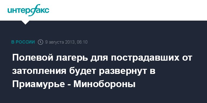 Москва. 9 августа. ИНТЕРФАКС - Полевой лагерь на 1200 мест для приема эвакуированных из зоны затопления жителей будет развернут в районе населенного пункта Овсянка Зейского района Амурской области силами подразделений Восточного военного округа (ВВО).