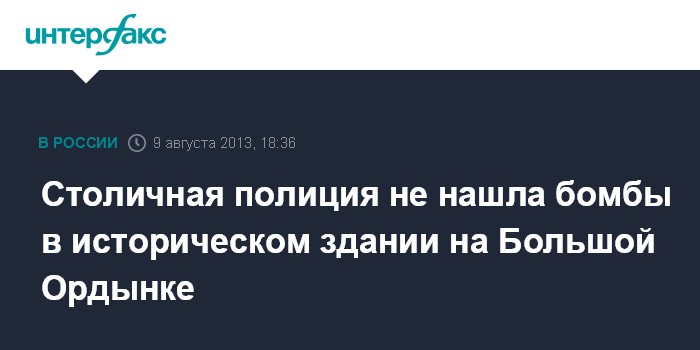Москва. 9 августа. INTERFAX.RU - Сообщение о взрывном устройстве, заложенном в здании в центре Москвы, не подтвердилось, сообщил "Интерфаксу" представитель пресс-службы столичной полиции.