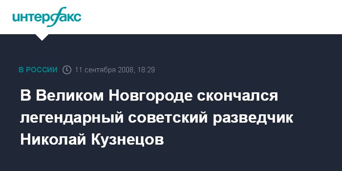 Москва. 11 сентября. INTERFAX.RU - В Великом Hовгороде после продолжительной болезни скончался легендарный разведчик, Герой Советского Союза и последний остававшийся в живых полный кавалер орденов Славы Hиколай Кузнецов.
