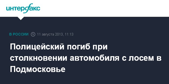 Москва. 11 августа. INTERFAX.RU - В Московской области на участке автотрассы "Балтия" накануне автомобиль столкнулся с выбежавшим на дорогу лосем, сообщает в воскресенье пресс-служба ГУ МВД по Подмосковью. "10 августа 2013 г. в 23:25 на 155 км автодороги М-9 "Балтия", 31-летний сотрудник УФМС по Московской области, управляя автомашиной Мицубиси, совершил наезд на перебегавшего проезжую часть лося. В результате происшествия 31-летний пассажир, инспектор ДПС "Северный" ГИБДД ГУ МВД России по Московской области, капитан полиции скончался на месте", - говорится в сообщении.