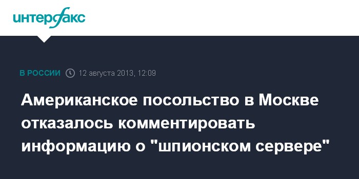 Москва. 12 августа. INTERFAX.RU - Посольство США в России не комментирует публикации в СМИ о том, что один из серверов глобальной американской системы слежки за пользователями интернета расположен в Москве.