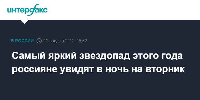 Санкт-Петербург. 12 августа. INTERFAX.RU - Жители России в ночь на вторник смогут наблюдать самый яркий звездопад в 2013 году, сообщил "Интерфаксу" старший научный сотрудник Института прикладной астрономии Российской академии наук Николай Железнов.