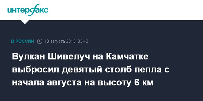 Петропавловск-Камчатский. 13 августа. ИНТЕРФАКС - ДАЛЬНИЙ ВОСТОК - Вулкан Шивелуч, извергающийся на Камчатке, выбросил очередной столб пепла на высоту 6 км над уровнем моря, сообщает камчатский филиал Геофизической службы РАН.