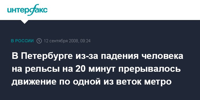 Москва. 12 сентября. INTERFAX.RU - В петербургском метрополитене в четверг вечером прерывалось движение на одной из линий после падения человека на рельсы, сообщили "Интерфаксу" в ГУП "Петербургский метрополитен".