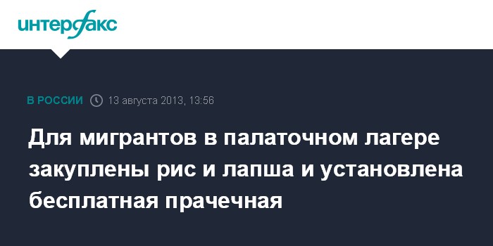 Москва. 13 августа. INTERFAX.RU - Для питания нелегальных мигрантов, размещенных в палаточном лагере в районе Гольяново на востоке Москвы, закуплено три тонны риса и более 10 тыс. упаковок лапши, сообщил и.о. главы департамента торговли и услуг столицы Алексей Немерюк журналистам во вторник.